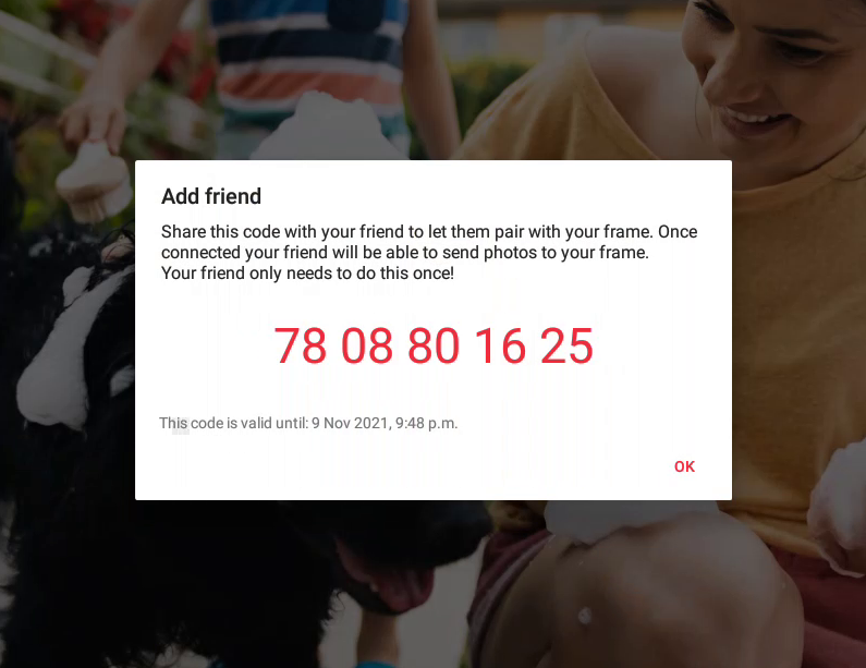 Remember that the code is only valid for 12 hours. If a code has expired, you can always generate a new code on your frame simply by pressing the add friend button again!